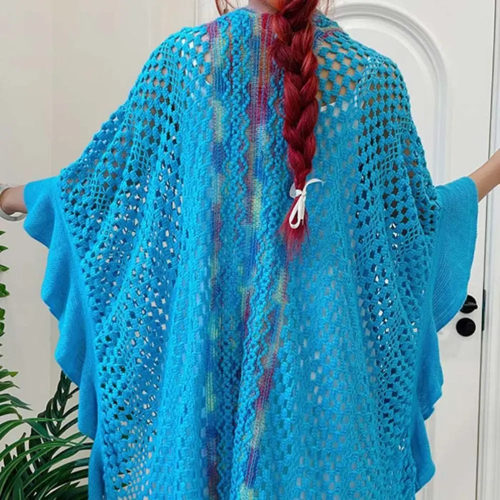 This versatile knitted shawl combines mid-weight warmth with bohemian styles.